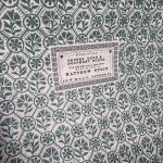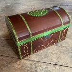 A small domed top leather bound box used to carry or store records, money or valuable personal items either at home or while traveling. This box is covered with green leather and two bands of light brown trim with a dust skirt that is cut with a scalloped pinking punch. The interior is lined with green patterned block printed paper that is made by hand using traditional printmaking techniques. The hardware consists of an Iron handle on top, iron hasp to keep the lid closed and wire wound hinges.